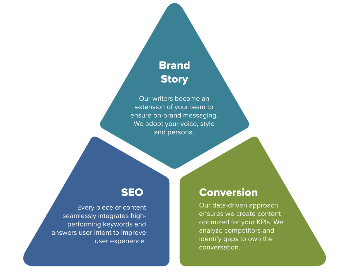 Our content writing services team offers content optimization solutions to improve your discoverability, engagement and conversions. Using proven SEO and conversion rate optimization (CRO) tactics, we’ll rework your titles, meta descriptions, on-page text, calls-to-action and more.