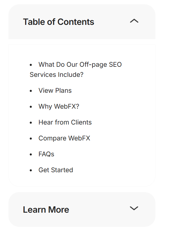 At WebFX, we offer genuine, spam-free off-page SEO services customized to your business. With our team, you eliminate the worry and risk that comes with agencies that use black-hat and spammy tactics to attract links to your website. Instead, you can relax and know that you’re improving your off-page SEO via respected, white-hat practices. Learn more about how our custom plans approach off-page SEO below: