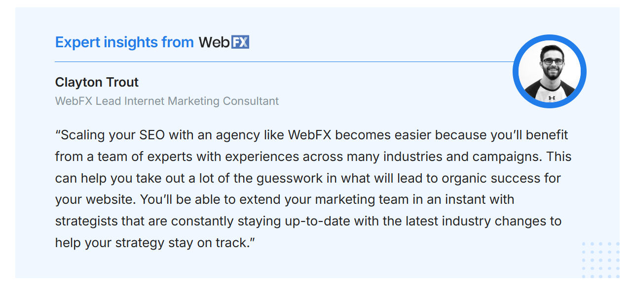 When businesses team up with WebFX for any digital marketing services (including on-page SEO services), they get a dedicated account manager that’s with them every step of the way. This way, clients have a singular person they can ask questions, voice concerns, and share ideas with.